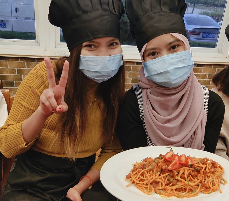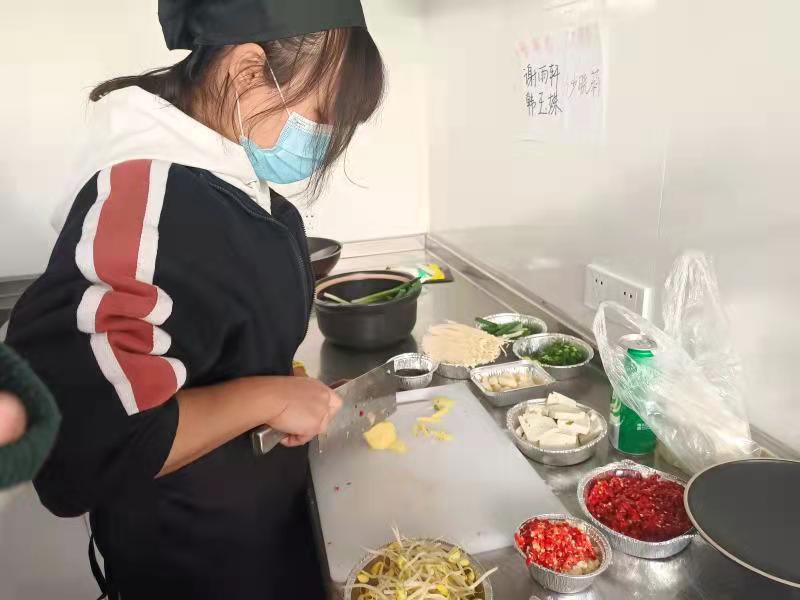 下午两点整,厨艺大赛正式开始,23名参赛选手戴好厨师帽,系好围裙,准备大显身手。本次比赛由中国员工和职工同台竞技,两人一组,制作具有中国特色和职工本国特色的美味菜肴。大家全心全力制作各种美食,最后由评审团打分,评选出最佳厨艺奖等七个奖项。来自印度尼西亚的的职工陈薇说:我们制作的是印度尼西亚传统菜肴,我想多拍一些照片给家人看,和家人分享在中国的生活,想让他们也尝尝中国菜。来自酒店公司西餐202班的张祎颖同学说:这是我第一次参加美食节,很开心和职工们分享亲手制作的美食,让他们感受中国美食文化。”