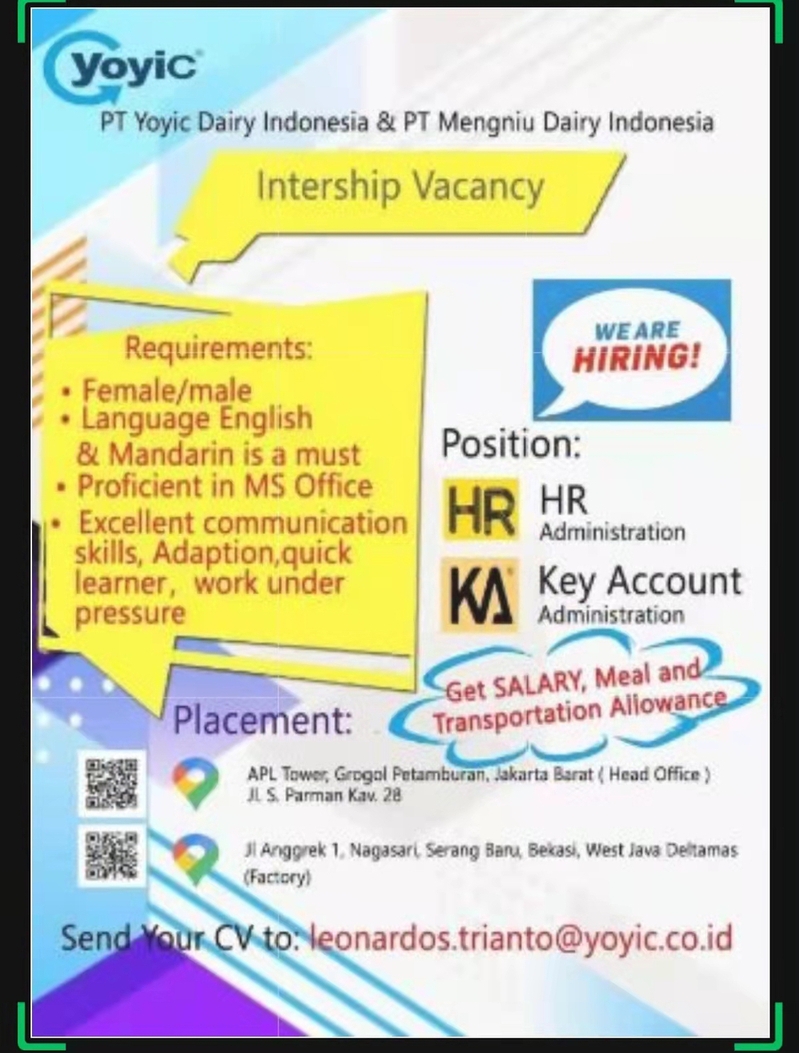 招聘信息:蒙牛乳业集团印尼Yoyic公司